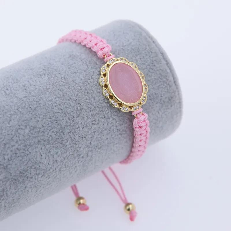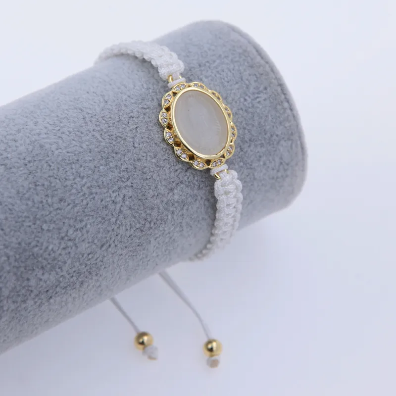 This bracelet is made from a lightweight cord with a gold-tone alloy charm at the center. The charm is accented with rhinestones for added shine, and the adjustable closure ensures a comfortable fit.
